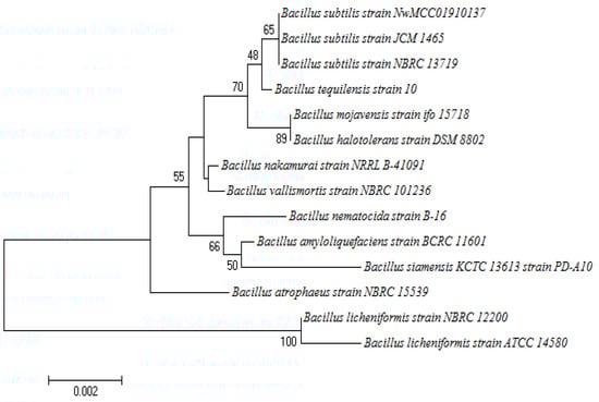 The colonies of the strain NwMCC01910137 on lactose broth solid plates were creamy white or slightly yellow, round in shape, had irregular edges and a rough and lusterless colony surface, and tested positive in Gram staining. The biochemical characteristics of the strain were determined by the sugar fermentation test, the indole test, the starch hydrolysis test, the V-P assay test, the methyl red test, and the gelatin hydrolysis test (Table 3). The candidate strain’s 16S rRNA sequence amplification product was approximately 1500 bp in size. The blast analysis of the sequenced 16S rRNA sequences against the reported sequences in the GenBank database showed 99.32% homology to Bacillus subtilis, 99.21% homology to Bacillus tequilensis, and 99.21% homology to B. subtilis and B. tequilensis. Based on its morphological and biochemical characteristics, NwMCC01910137 belonged to the B. subtilis strain. A neighbor-joining phylogenetic tree was constructed based on the full sequence of the 16S rRNA gene by using MEGA 7.0 software (Figure 4). The measured 16S rRNA gene sequence was submitted to the NCBI to obtain the GenBank accession number (MZ031298) and named B. subtilis strain NwMCC01910137. A previous study mentioned that B. subtilis was proven to be able to perform blood meal degradation [35] while also showing a good blood clot degradation capability [36].