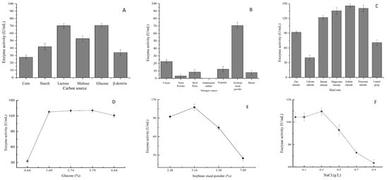 The selected carbon source type and concentration are shown in Figure 5A,D. Neutral protease isolated from B. subtilis showed the highest activity of 70.79 U/mL when glucose was used as the carbon source, followed by lactose and maltose. The lowest enzyme activity of 27.7 U/mL was observed when corn starch was used as the carbon source. Glucose was mostly used in the medium for enzyme production because of its accessibility by microorganisms [37,38]. Glucose was then screened for concentration, and the amount of glucose added was set to 0.64%, 1.69%, 2.74%, 3.79%, and 4.84% (w/v) according to different carbon-to-nitrogen ratios (8, 10, 12, 14, and 16). As shown in Figure 5D, the highest protease enzyme activity of 130.46 U/mL was observed when the amount of glucose added was 3.79%. Excess concentration of glucose was reported to slow down the growth of microorganisms and affect their enzymatic activity due to the negative effect on osmotic pressure [39,40].