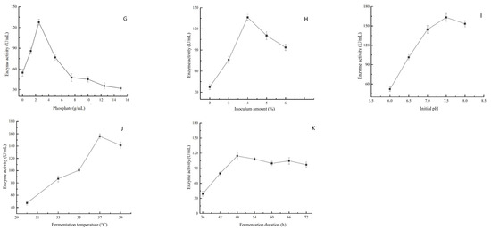 The single-factor optimization of enzyme production conditions of strain NwMCC01910137. (A) Carbon source species selection; (B) nitrogen source species selection; (C) metal ion species selection; (D) carbon source concentration; (E) nitrogen source concentration; (F) metal ion concentration; (G) phosphate selection; (H) inoculum amount selection; (I) initial pH selection; (J) fermentation temperature selection; (K) fermentation time selection.