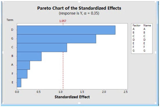 Placket–Burman test analysis of variance Pareto chart (A = X1, B = X2, C = X3, D = X4, E = X5, F = X6, and G = X7).