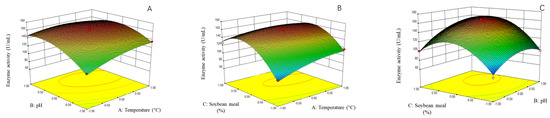 Response surface of protease activity of two-factor interaction: (A) temperature vs. pH, (B) temperature vs. soybean meal, and (C) pH vs. soybean meal.