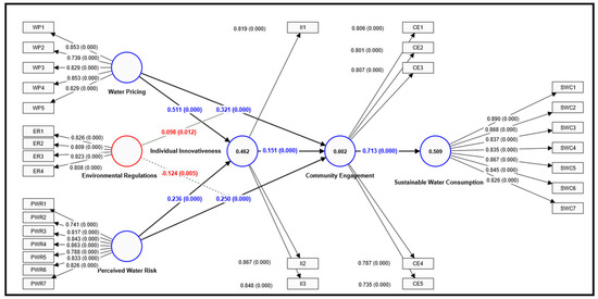The path coefficient indicates the direct influence of one variable, conceptualized as a causal factor, on another variable designated as an outcome. The findings of the structural equation modelling using PLS for the proposed model are presented in Table 6. This shows that all hypotheses (H1a, H1b, H2a, H2b, H3, and H4) that included attributes such as water pricing, PWR, CE, and individual innovativeness were positive and significant. For example, for hypothesis H1a it was found that there was a substantial positive influence of WP on II (β = 0.511, p < 0.001), implying that for every unit increase in water pricing, individual innovativeness increases by 0.511 units. Similarly, hypothesis H1b revealed a significant positive effect of WP on CE (β = 0.321, p < 0.001), indicating that higher WP corresponds to increased CE, with a 0.321 increase in CE for every unit increase in WP. Additionally, hypothesis H2a suggested a positive relationship between PWR and II (β = 0.236, p < 0.001), with a 0.236 increase in II for every unit increase in PWR. Likewise, hypothesis H2b demonstrated a positive effect of PWR on CE (β = 0.250, p < 0.001), indicating that higher PWR leads to increased CE, with a 0.250 increase in CE for every unit increase in PWR. Furthermore, hypothesis H3 indicated a positive influence of II on CE (β = 0.151, p < 0.001), suggesting that more innovative individuals are associated with increased CE, with a 0.151 increase in CE for every unit increase in II. Finally, hypothesis H4 underscored a strong positive relationship between CE and sustainable water consumption (SWC) (β = 0.713, p < 0.001), indicating that higher levels of CE are associated with greater sustainable water consumption, with a 0.713 increase in SWC for every unit increase in CE.