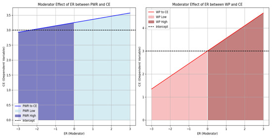 However, ERs may exert a negative moderation when such regulations are perceived as overly restrictive, ambiguous, or irrelevant to the community’s needs. For instance, overly stringent water-use restrictions or regulations not well-aligned with local conditions can trigger feelings of reactance, where individuals resist or reject these measures because they feel their autonomy or freedom to act is being threatened. This is consistent with Reactance Theory, which suggests that when individuals perceive a loss of control over their actions due to external regulations, they may disengage or undermine efforts to comply [147]. In such cases, while PWR might initially heighten concern and trigger community involvement in conservation, poorly designed or executed ERs can diminish the community’s sense of collective efficacy, weakening the relationship between PWR and CE. Furthermore, the moderating effect of ER is also supported by Regulatory Focus Theory, which posits that people’s motivation can either be driven by a promotion focus (pursuing gains) or a prevention focus (avoiding losses). Within the context of PWR, prevention-focused individuals may become more active in water-saving behaviors when they perceive a risk, such as water scarcity. However, suppose ERs are perceived as repressive or punitive. In that case, this can shift individuals’ orientation from prevention to promotion, where they prioritize actions that are experienced as less constrained, thereby undermining the PWR–CE association.