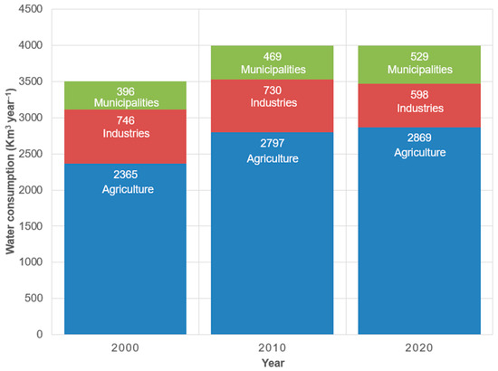 Global water consumption trends based on sectors between 2000 and 2020 (in km3 year−1). Data recovered from [1].
