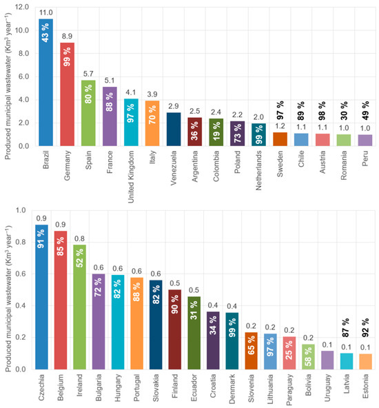 The 2021 wastewater production volumes in South America and the European Union across countries, in percentage (%) of safe treatment of wastewater. Data recovered from [3,29].
