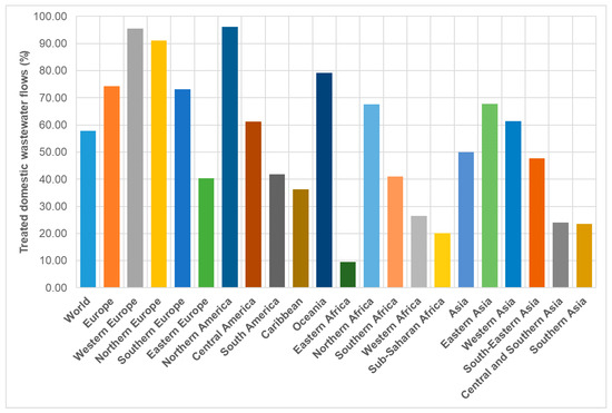 Percentage proportions of safe domestic wastewater treatment in world and global regions in 2022. Data recovered from [29].