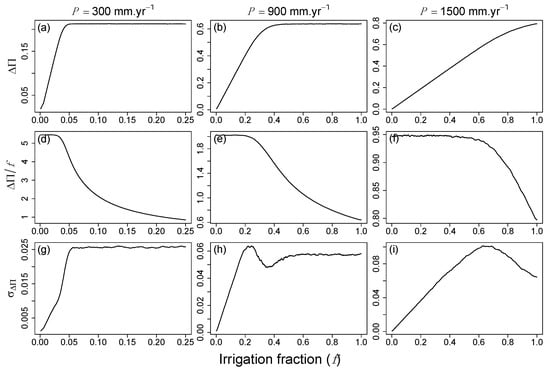 Plots of the trends of three indicators (rows) with the increasing irrigation fraction (f) under different precipitation regimes (columns). is the irrigation profits, /f is the irrigation profit per unit area, and is the standard deviation of during the simulation period indicating the resilience of to climate variation. will definitely follow the increase in f, and the more humid a region is, the greater f will have to be to reach the upper bound of because more precipitation can feed a larger irrigated area, resulting in the increase in . /f will certainly decrease with the f gradients as fixed precipitation cannot feed an unlimited irrigation area. However, more precipitation can delay the emergence of a decrease. will increase following irrgation fraction until the upper bound is reached. Plots (a–c) are the relationships between irrigation fraction f and irrigation profits under the precipitation of 300 mm/yr, 900 mm/yr, and 1500 mm/yr, respectively. Plots (d–f) are the relationships between irrigation fraction f and irrigation profit per unit area /f under the precipitation of 300 mm/yr, 900 mm/yr, and 1500 mm/yr, respectively. Plots (g–i) are the relationships between irrigation fraction f and the standard deviation of irrigation profits under the precipitation of 300 mm/yr, 900 mm/yr, and 1500 mm/yr, respectively.