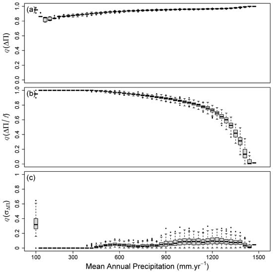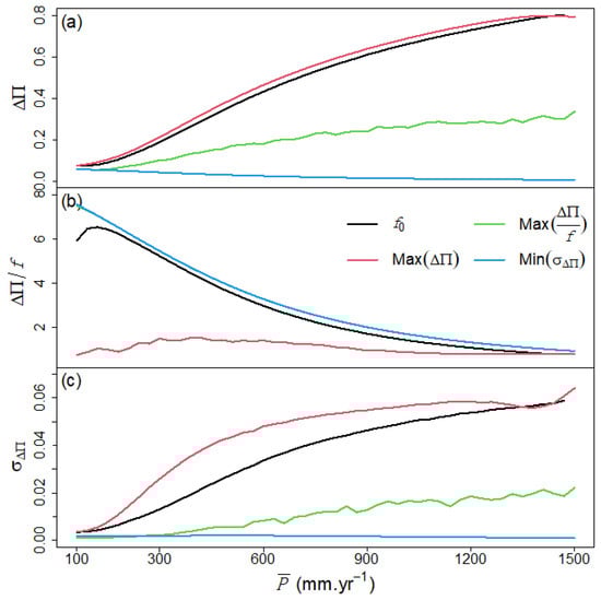 The values of comparison function of f0 within their respective comparison datasets of irrigation profit , irrigation profit per unit area , and the standard deviation of irrigation profit as a function of the mean annual precipitation. (a) corresponding to f0 along the gradient of mean annual precipitation. (b) corresponding to f0 along the gradient of mean annual precipitation. (c) corresponding to f0 along the gradient of mean annual precipitation.