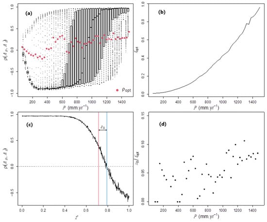 The performance of and () under different gradients of P and depictions of . (a) The relationship between mean annual precipitation and ; is the value of corresponding to . (b) The relationship between mean annual precipitation and . (c) The relationship between irrigation fraction f and . The blue vertical line represents corresponding to , and the red vertical line represents corresponding to . . (d) The relationship between mean annual precipitation and .