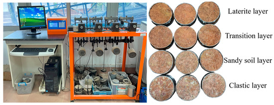 The soil in the Benggang gully wall is divided into four layers, from top to bottom: the laterite layer, transition layer, sandy soil layer, and clastic layer (Figure 1c). The basic characteristics of these soil layers are summarized in Table 1. Soil samples were collected using a standard circular ring knife (height: 20 mm, diameter: 61.8 mm), with 45 replicate samples taken from the middle of each soil layer at the same depth, spaced 0.10 m apart. This resulted in a total of 180 in situ ring knife samples for determining the soil shear strength. Additionally, soil samples were collected using a standard circular ring cutter (height: 50 mm, diameter: 50.46 mm) to determine the basic physical properties and SWCC.