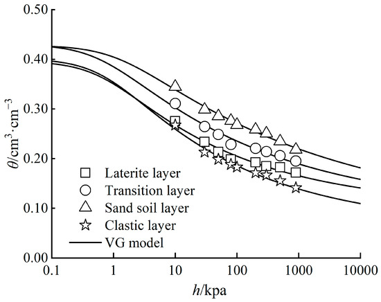 The trends of the SWCC of all the soil layers throughout the whole suction range were consistent (Figure 4). In the saturated state (h < 30 kPa), the SWC of all the soil layers decreased rapidly with increasing matrix suction and exhibited a large curve slope. This resulted from the good water connectivity of the soil pores, the water was easily discharged from the macropores under low suction, the adsorption of soil and water was weak, and the water was transferred mainly through capillary tubes in liquid form [4,13]. In the unsaturated state (h > 30 kPa), the slopes of the curves of all the soil layers gradually decreased, and the SWC decreased with increasing matrix suction. Soil water mainly exists in small pores, and the water holding capacity depends on water–air movement and moisture absorption of soil particles, leading to poor water continuity and difficulty in discharge [13,29]. When the matrix suction exceeds 600 kPa, the curve tends to flatten, and the soil water holding capacity becomes stable because residual water only exists in the small pores and the rate of decrease in the SWC significantly slows with increasing suction [4].