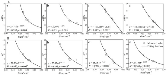 Fitted curves of the SWC versus c (A) and angle of φ (B) for different soil layers of the Benggang gully wall. Note: a–d denote the laterite layer, transition layer, sandy soil layer, and clastic layer, respectively. * indicates a significant correlation (p < 0.05); ** indicates a highly significant correlation (p < 0.01).