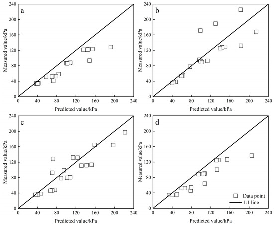 To investigate the adaptability of different soil layers to the unsaturated shear strength equation under test conditions, the matrix suctions of different soil layers were introduced into Formulas (8)–(11) to obtain the predicted values. The predicted values of different soil layers and the measured values were then drawn as a 1:1 plot (Figure 7), and the predicted shear strength values of different soil layers were compared with the measured values under the test conditions. The results of the simulated values and measured values were in good agreement (p < 0.01), as shown in Table 5.