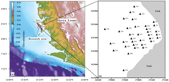 Location map of research area (a) and sampling sites (b). The coordinate system of (b) is CGCS2000, and the central longitude is 12° W.
