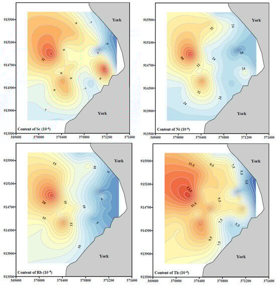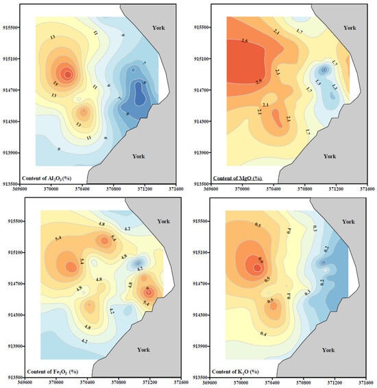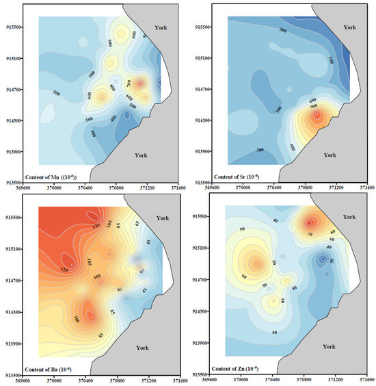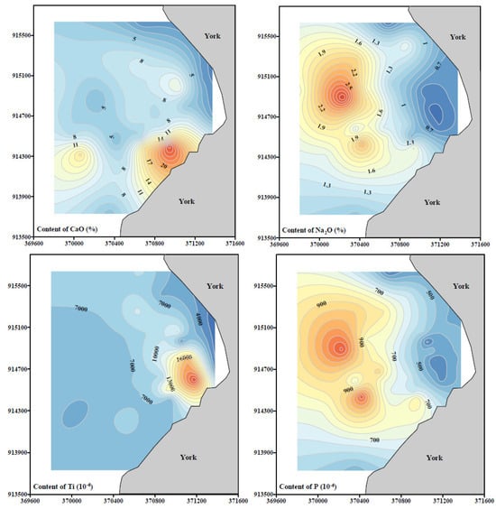 Figure 5 shows the distribution of major and trace elements of the sediments. Except for Ca, Ti, Sr, and Mn, the content of most elements shows a decreasing trend from the nearshore to offshore area. The contents of Ca are relatively stable except for a few stations. The distribution patterns of Ti and Sr are similar, with some stations showing high content and others showing little change. The Mn content in the sediment of the research area does not change significantly, and there is no obvious distribution pattern (Figure 5).