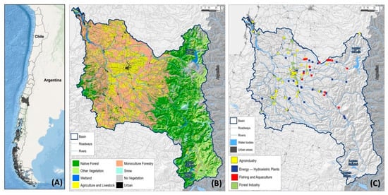 Figure 2A illustrates the land use in the BRB. The dominant land use is primarily linked to monoculture forestry practices (51% of its total area), while native forests are largely concentrated in the Andean region of the basin [50]. Additionally, the largest urban area in the basin, the Metropolitan Area of Concepción (MAC), is situated near the river’s mouth. Figure 2B illustrates the territorial distribution of key economic activities, namely, agroindustry, energy generation, fisheries and aquaculture, and the forest industry.
