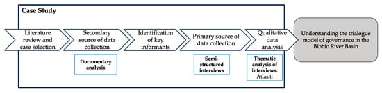 This research design followed a qualitative strategy (Figure 3), which reflects a perspective of social reality as a continually evolving outcome of individuals’ interactions and creations [55]. This approach helped to gain insights into the perspectives of those actively engaged in social processes related to water governance and management. Fundamentally, qualitative research seeks to understand actions, norms, and values from the viewpoints of the people who create and experience them, recognizing multiple realities and prioritizing understanding phenomena [56]. In this case study, the reality is created by each of the most representative stakeholders embedded in the governance trialogue, which acted as a primary information source. In addition, documents were used as a secondary information source.