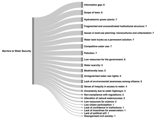 Barriers to water security identified in the Biobío River Basin, with the number of interviewees who mentioned each barrier listed on the right. Source: Own elaboration, using SankeyMATIC.com (accessed on 15 November 2024).