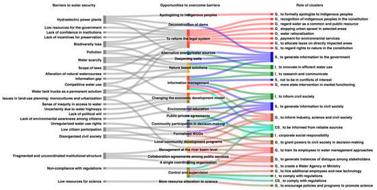 Data gathered from interviews were analyzed using thematic analysis supported by Atlas.ti software (online version). Initially, segments of the interview transcripts were coded to identify patterns relevant to the study using an open coding approach where the researchers did not use pre-set codes but instead developed and refined them throughout the coding process [61]. By the end of this step, the codes were organized into broader themes that were significant in providing insights for this study: (i) barriers to advancing toward water security; (ii) opportunities to overcome such barriers; and (iii) the role of government, science, industry, and civil society in implementing such opportunities.