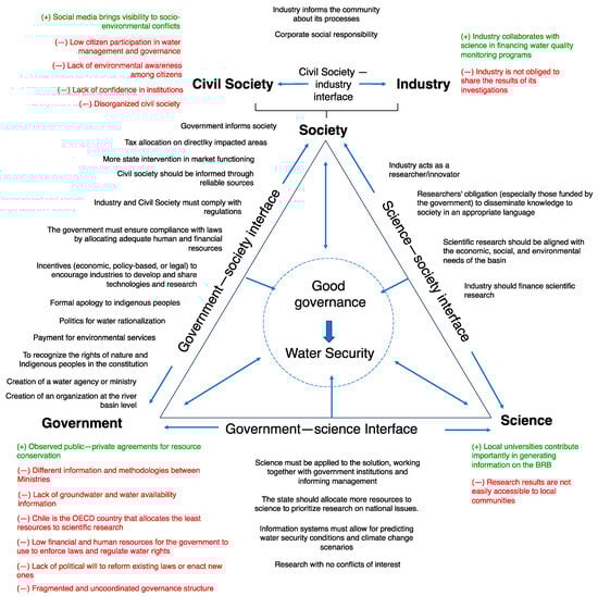 In this context, the trialogue model provides a robust framework for examining how water security challenges are addressed within existing institutional arrangements. By applying the trialogue model at the basin level in Chile, this study aimed to uncover the roles that various actors can play in strengthening governance systems. The model emphasizes identifying stakeholders’ viewpoints and interrelationships, which is crucial for fostering agreement and cooperation among diverse groups and is an essential factor for the successful adoption and implementation of effective water management initiatives [41].