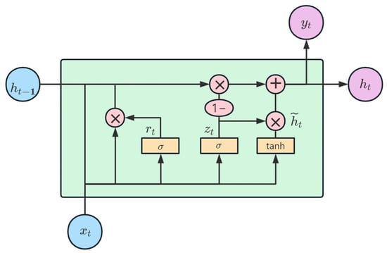 The GRU, first introduced by Chung et al. in 2014, is an optimized model based on LSTM and is a variant of the RNN [29]. It addresses the problems of gradient explosion and vanishing gradients when dealing with long-term dependencies by introducing gate structures. Compared to LSTM, the GRU network has only two gate structures: the reset gate and the update gate. The reset gate combines the current input information with past information, while the update gate retains memory information by setting time steps. Its structure is illustrated in Figure 3.