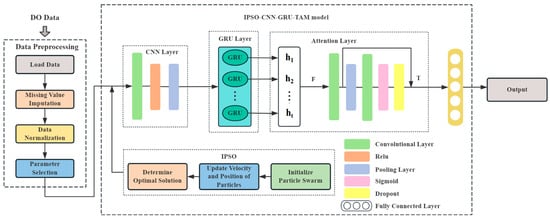 To address the above issues, this study proposes the IPSO-CNN-GRU-TAM model, which integrates improved particle swarm optimization, the temporal attention mechanism, the convolutional neural network, and the gated recurrent unit to model and predict the DO content in aquaculture. The aim is to increase prediction accuracy, verify the reliability and accuracy of the model, and provide a decision-making basis for DO regulation.