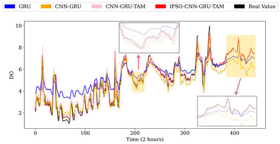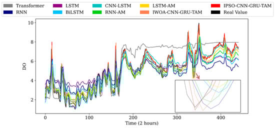 The DO content prediction results are depicted in Figure 10. The RNN, LSTM, and Transformer models exhibit relatively large prediction errors. In contrast, the prediction curves for the BiLSTM, CNN-LSTM, RNN-AM, LSTM-AM, IWOA-CNN-GRU-TAM, and IPSO-CNN-GRU-TAM models are relatively similar. Upon closer inspection of the curve details, it is evident that the fitting curves of other models exhibit significant deviations at peak and valley points, whereas the fitting curve of the IPSO-CNN-GRU-TAM model more closely aligns with the true values, demonstrating superior accuracy and tracking performance in predicting the DO content.