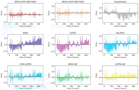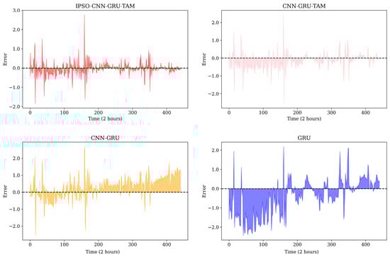 Figure 7 and Figure 8 demonstrate that the model presented in this study surpasses the GRU, CNN-GRU, and CNN-GRU-TAM models in terms of prediction accuracy and curve tracking, with notably lower prediction errors. Additionally, it is evident that the CNN and TAM significantly influence the model’s predictive performance; their removal results in a substantial shift in the model’s prediction curve away from the actual values.