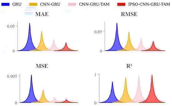 From Table 2 and Figure 9, it is evident that the RMSE of the CNN-GRU model, compared to the GRU model, decreased significantly by 32.36% and the R2 increased markedly by 19.77%. This significant improvement mainly results from the introduction of the CNN architecture. Through convolution operations, CNNs efficiently extract key features from input data. This enhancement strengthens the model’s ability to capture local patterns in time series, leading to a substantial increase in prediction accuracy. Compared to the CNN-GRU model, the CNN-GRU-TAM model demonstrated a 34.09% reduction in RMSE and a 7.83% increase in R2, indicating that the inclusion of TAM effectively captures intricate temporal dynamics and extracts dependency structures. Compared to the CNN-GRU-TAM model, the IPSO-CNN-GRU-TAM model reduced RMSE by 22.43%, enhanced R2 by 2.22%, and decreased the running time by 93 s. This demonstrates that the IPSO algorithm precisely optimizes model parameters to better align with data characteristics, thus enhancing the model’s prediction accuracy, generalization capacity, and convergence speed while significantly reducing the running time. In conclusion, the integration of CNN, TAM, and IPSO significantly enhances the model’s predictive performance.