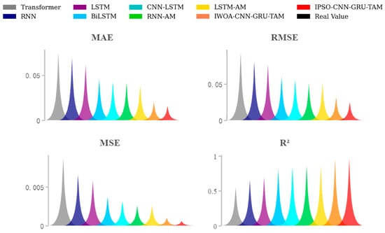 However, curve fitting can only macroscopically assess the direct proximity between actual and predicted values, failing to provide a quantitative mathematical analysis. Table 3 consolidates the performance metrics for the other models mentioned above and the IPSO-CNN-GRU-TAM model introduced in this study, while Figure 11 presents visual representations of these metrics, namely, MAE, MAPE, RMSE, and R2. The comparison of these evaluation metrics clearly shows that the IPSO-CNN-GRU-TAM model significantly outperforms the other models in all evaluation metrics, with MAE, RMSE, MSE, and R2 at 0.0158, 0.0249, 0.0006, and 0.9682, respectively.
