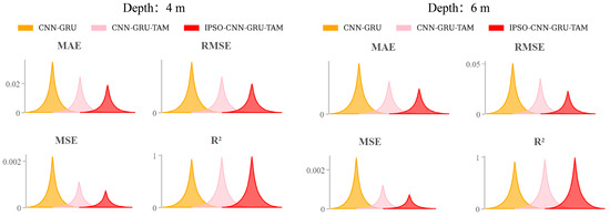According to Figure 15 and Table 5 and Table 6, the IPSO-CNN-GRU-TAM model performs excellently on datasets at 4-m and 6-m depths. Specifically, on the 4-m depth dataset, compared to the CNN-GRU and CNN-GRU-TAM models, the RMSE of the IPSO-CNN-GRU-TAM model decreased by 44.04% and 21.02%, respectively. On the 6-m depth dataset, the RMSE decreased by 55.05% and 35.51%, respectively. Additionally, the R2 value of the IPSO-CNN-GRU-TAM model improved.