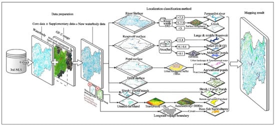 Wetland classification followed national standards, regulations, and the latest laws and was optimized by combining remote sensing digital products and spatial location analysis for the secondary segmentation of the 3rd NLS. The 3rd NLS data ensured the accuracy of basic waterbody boundaries.