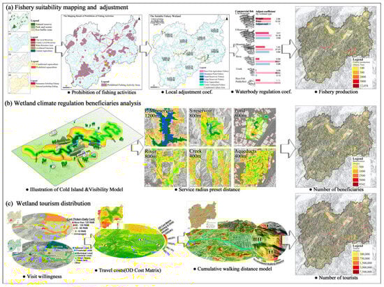 Spatial calculation methods for functional quantities maps based on interpolation optimization. (a) Fishery suitability mapping and adjustment. (b) Wetland climate regulation beneficiaries analysis and (c) wetland tourism distribution.