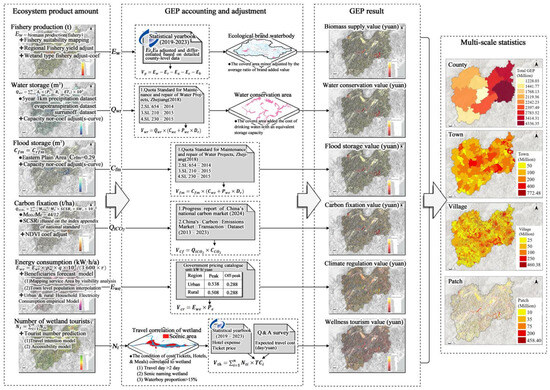 Wetlands, often termed the “kidneys of the Earth,” are among the most valuable ecosystems due to their high productivity and diverse ecosystem services [1]. As global wetland degradation intensifies, there is increasing recognition of the need for conservation, acknowledging wetlands as essential environmental assets and vital safeguards for the future [2,3]. In response, the gross ecosystem product (GEP) framework has emerged as a promising tool for quantifying ecosystems’ economic value, facilitating the integration of ecological benefits into national and local economic planning [4]. In China, the “Two Mountains” theory, which emphasizes that “lucid waters and lush mountains are invaluable assets,” guides development policy, promoting the use of GEP to balance economic growth with ecological preservation [5].