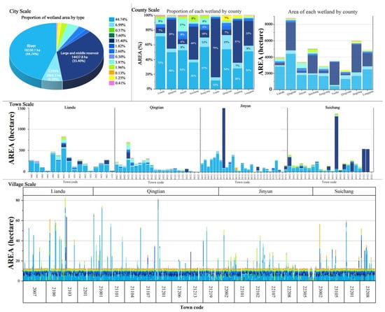 Overall, the distribution of wetland waterbodies at different scales shows significant variations (Figure 6). There are notable differences in the wetland areas and types between counties, towns, and villages, reflecting the complexity and diversity of wetland ecosystems across different administrative divisions. These differences may also be related to the geographical conditions, ecological management practices, and economic development approaches of each region. The reclassified wetland waterbodies were assigned geographic attribute information, including the administrative affiliation, area, and corresponding functional quantities, which could be further used for wetland product value accounting and multi-category wetland management.