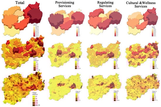 At the village scale, the region was further divided into over 2000 administrative units, with the number of wetland types becoming even more reduced and showing greater variation in local water environments and economic differences. Accounting and visualization results at the village scale largely continued the spatial distribution patterns observed at the county level. However, due to the influence of wetland classification and the administrative attribution of waterbodies, the value units were assigned with greater precision. This refinement also provided clearer insights into localized resource utilization and conservation opportunities, enabling more targeted guidance for grassroots planning and projects.