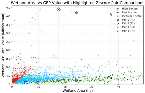 Compared to the township scale, village-level wetlands are more “public-oriented” and practical waterbodies, serving as direct sites for water resource planning and landscape projects. By aligning wetland services with local needs, classified GEP accounting provides a clearer reflection of village-level wetland characteristics and offers valuable insights for planning and design decisions. As presented in Table 5, four pairs of villages were selected based on two criteria: significant differences in wetland contribution rates (Z-scores) and high similarity in wetland areas (Figure 8). The results indicate that cultural services are the dominant contributor to the total GEP, revealing a significant disparity between cultural services and other ecosystem services. This dominance is primarily attributed to the “Tourist number” variable, as cumulative tourist consumption substantially impacts the total GEP, even under low individual expenditure scenarios. Consequently, regulatory services are often overshadowed by cultural services, yet they play a critical ecological role that is frequently undervalued. For instance, in the P3 group, while P3-1 recorded a higher total GEP, P3-2 exhibited stronger regulatory services, highlighting the significant contribution of regulatory services in villages with limited tourism development. Similar patterns were observed in the P1, P2, and P4 groups, where regulatory service contribution rates between paired villages were relatively close, further emphasizing their importance even when they did not dominate the total GEP.
