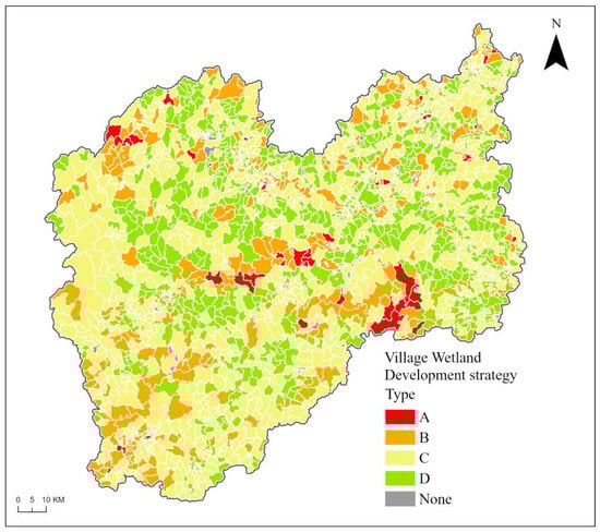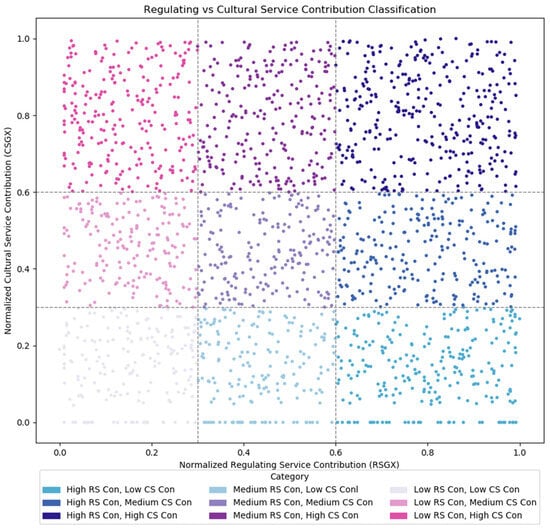 The clustering analysis classified village-level wetlands into nine categories based on normalized Regulating Service Contribution (RScon) and Cultural Service Contribution (CScon) (Figure 9). These nine categories highlight the differences in ecological and cultural contributions among village wetlands and provide actionable insights for decision-makers in evaluating wetland functions. The wetland area proportion indicator is designed to measure whether a village is highly dependent on water resources and wetland-related economic benefits. Both indicators are weighted equally at 0.5. For more detailed information, please refer to Table 6 and Table 7. The results are illustrated in Figure 10.