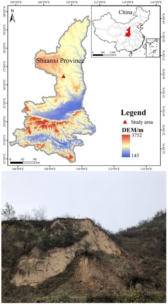 In this study, we examine a loess landslide in Qiangchaigou, Ganquan County, Yan’an City, Shaanxi Province, located in the village of Qiangchaigou, Shimen Township, which is an earthy landslide, with the coordinates of 109°09′22″ E longitude and 36°23′09″ N latitude (Figure 1). The study area has a semi-humid inland monsoon climate, with a large temperature difference between day and night, an average annual temperature of 8.6 °C, average sunshine of 6.8 h, an average annual frost-free period of 148 d and annual rainfall of 126.3 mm []. The soil types mainly include loess, chestnut calcareous soil, black clayey soil and grey calcareous soil. The study area is located in the southeast of the Ordos Basin Shanbei Slope, in the central part of the Shanbei Terrace Depression, which is mainly a sedimentary rock system of the Mesozoic Era [].
