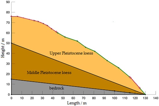 According to the field survey and relevant geological data, the landslide body is Quaternary Upper Pleistocene chalk. The strata of the landslide are, from top to bottom, Quaternary Upper Pleistocene chalk, Quaternary Upper Pleistocene loess, Quaternary Middle Pleistocene loess and Cretaceous muddy sandstone. The slip zone is the contact zone of Cretaceous sandstone and loess; the slip bed is Cretaceous sandstone. Accordingly, the evaluation model of the landslide was constructed, and the landslide profile was simplified to Quaternary Upper Pleistocene loess, Quaternary Middle Pleistocene loess and Cretaceous sandstone (Figure 2).