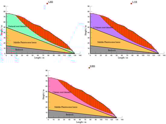 Simulation results of slope stability under different root density conditions.