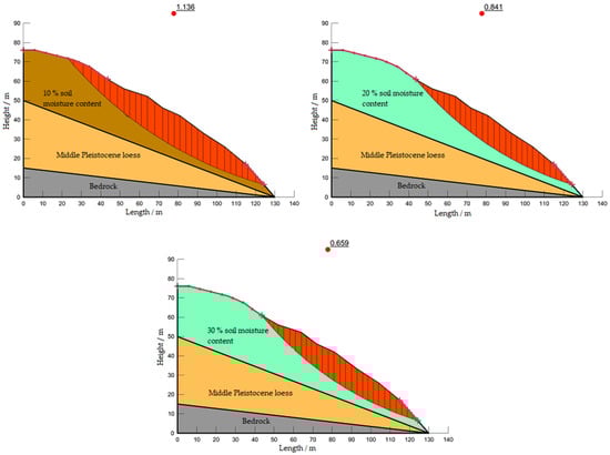 Figure 4 shows the simulation results of the landslide in Ganquan County under different soil moisture content conditions. The trend is that the higher the moisture content, the lower the slope coefficient of the landslide. The landslide is in a stable state under a 10% moisture content, and it is in a very unstable state under a 30% moisture content, with a stability coefficient of 0.659. The above data show that the root density of vegetation and rainfall are important factors for the occurrence of landslides.
