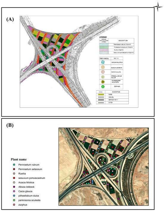 Plants as-built based on GPS instruments (Trimble R12 GNSS Receiver), AutoCAD, and ArcMap Map software programs: (A) Drawing as built utilizing AutoCad software. (B) The locations of different vegetation species using seven anchor pixels for each plant which verified by GPS instrument surveying.