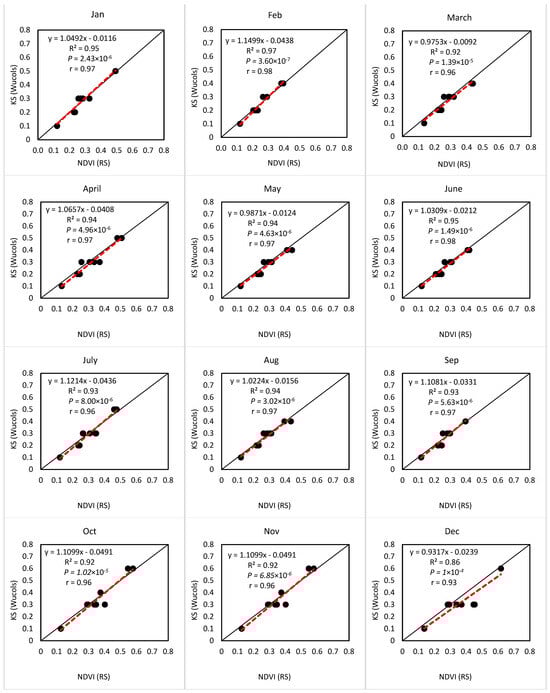The NDVI estimated using Landsat 8 satellite images throughout 12 months of 2023 versus KS estimated and classified by WUCOLS.
