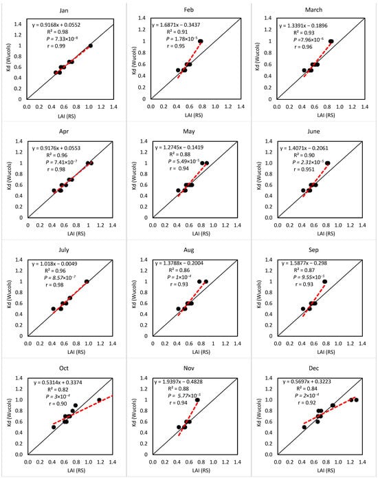 The LAI estimated using Landsat 8 satellite images throughout 12 months of 2023 versus Kd estimated and classified by WUCOLS.