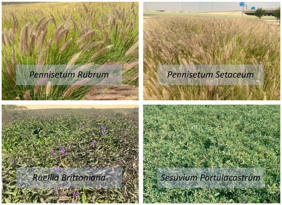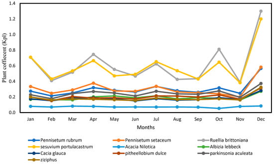 Microclimates already exist in all landscapes and should be incorporated when estimating plant water loss. Urban landscape characteristics, such as structures, asphalt, temperature, wind speed, brightness of light, and humidity, vary considerably among landscapes, resulting in differences in microclimates. In order to account for these variances, a microclimate factor () is utilized.  ranges between 0.5 and 1.4, as regarded by WUCOLS and tabulated in Table 1. This consideration is vital, since urban microclimates can lead to increased ET rates, thus necessitating adjustments in irrigation practices [,]. A  value of 1.4 was applied during this study, and the final  values are displayed in Table 2. Meanwhile the  value for Pennisetum rubrum, Pennisetum setaceum, and Parkinsonia aculeata is 0.3, which means that it agrees with the WUCOLS classification for low water demand needs. Furthermore, the  for Albizia lebbeck, Cacia glauca, Pitheellobium dulce, and Ziziphus is 0.2, and the lowest  is 0.1 for Acacia nilotica. Additionally, Ruellia brittoniana and Sesuvium portulacastrum agreed with the WUCOLS moderate water demand classification, with a  of 0.6, which means that these plants need 60% of the actual water demand to sustain health, attractiveness, and reasonable growth.