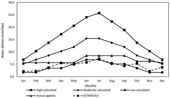 High calculated water demand reached its peak in July at 25.7 mm/day, indicating significant water needs during the hottest months (June to August), aligned with increased evaporation rates and plant growth needs. Additionally, moderate calculated water demand also saw a maximum of 15.4 mm/day in both June and July, demonstrating a trend consistent with rising temperatures and plant water demand during summer. Furthermore, low calculated water demand reflected lesser fluctuations, peaking at 6.9 units in the summer but consistently remaining lower throughout the year.