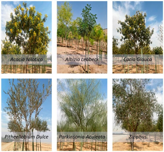 Trimble R12 GNSS technology improves performance and signal management, allowing for precise positioning even under the canopy of trees or near buildings. The study site contains the ten most common plants used in Green Riyadh initiative, which consists of 6 tree species  , lebbeck, , , , and ), with a total number of 9635 trees. Further, 4 species of ground covers and shrubs , , and ) cover an area of 115,500 m2.