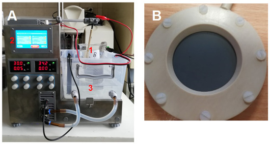 Set for electrolytic oxidation of micropollutants. (A): electrolyser with thermostatic bath (1—electrochemical reactor, 2—power supply, and 3—electromagnetic stirrer) and (B): holder including BDD anode.