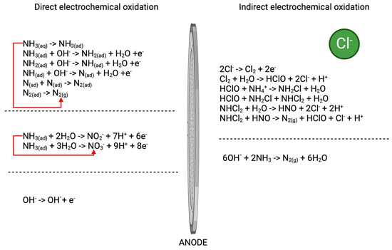 Reactions showing direct and indirect electrochemical oxidation of ammonium compounds in the presence of chloride ions [34,35].